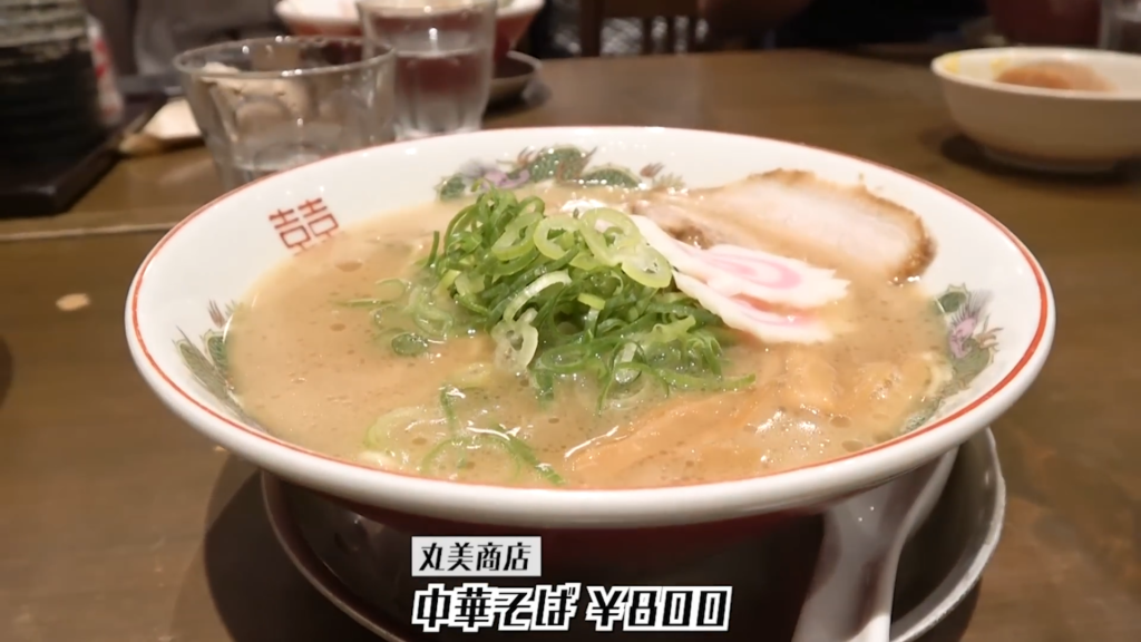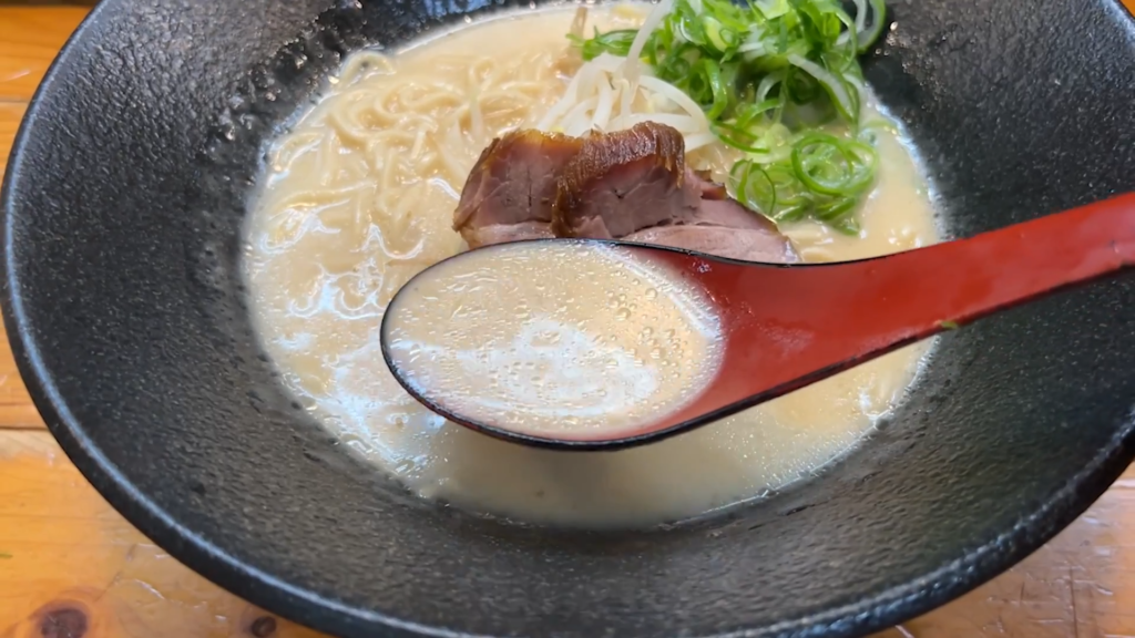 豚骨色のスープに、鮮やかなかまぼこが映える一杯で、観光地らしさも感じるビジュアルです。それでは、いただきます。