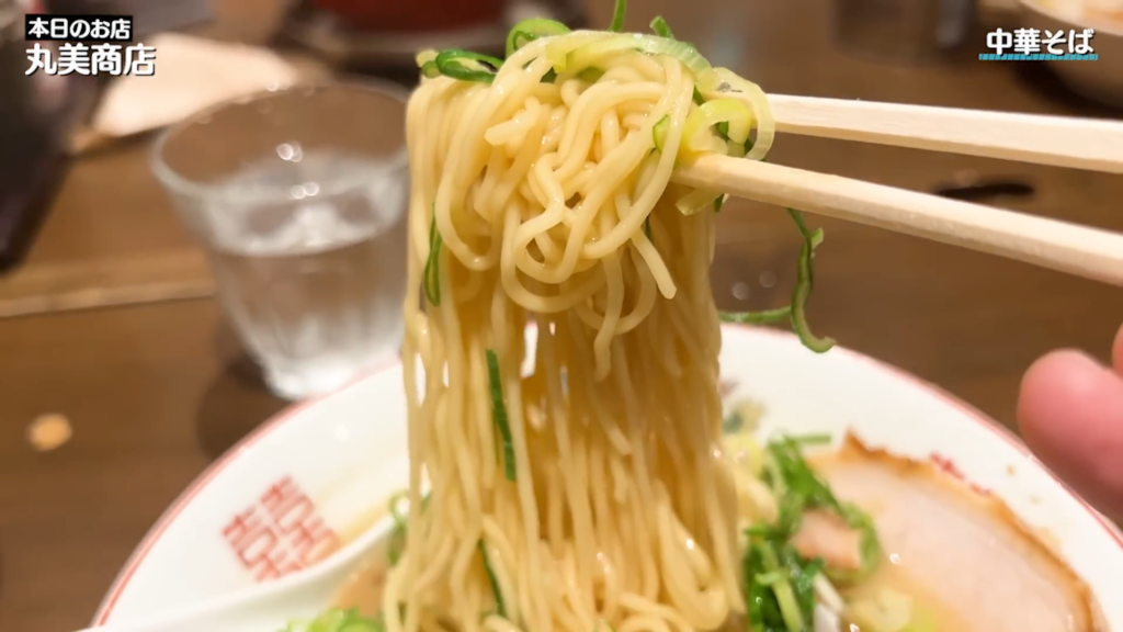 続いて麺をリフトして、よっしゃ、すする!和歌山の老舗、福助製麺所製の黄色味がかった中細麺は、豚骨香るスープとぴったり寄り添い、スルスルとしたすすり心地が実に心地いい。軽やかで引っかかりがなく、どこまでもすすり続けられそうな感覚です。屋台発祥の和歌山ラーメン、その代表格はやはり伊達じゃなく、ネギのアクセントも楽しみながら、箸が止まりません。
