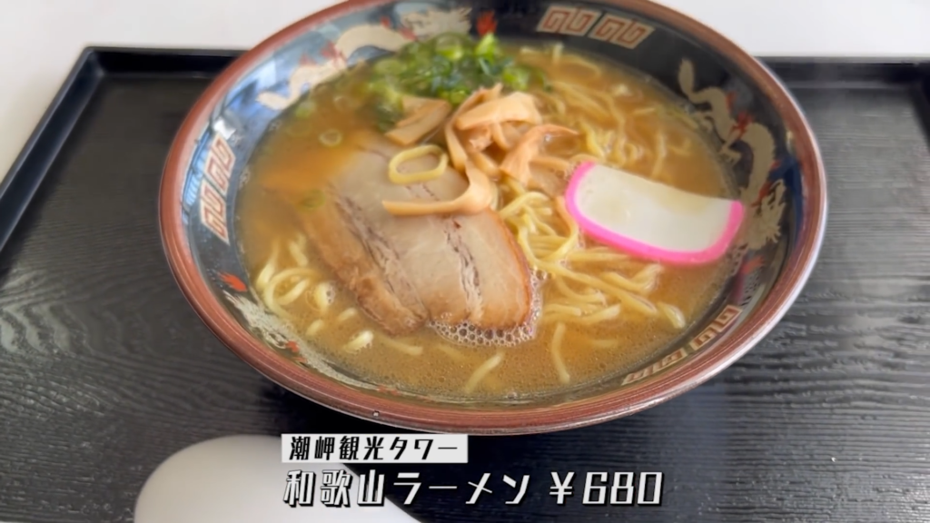 スープを味わってみると、いわゆる観光地のフードコートで提供される和歌山ラーメンといった印象で、親しみやすくすっと入ってくる味わいです。目の前に広がる本州最南端の景色をスパイスにしながらすすっていくと、不思議とエモさが増していきます。