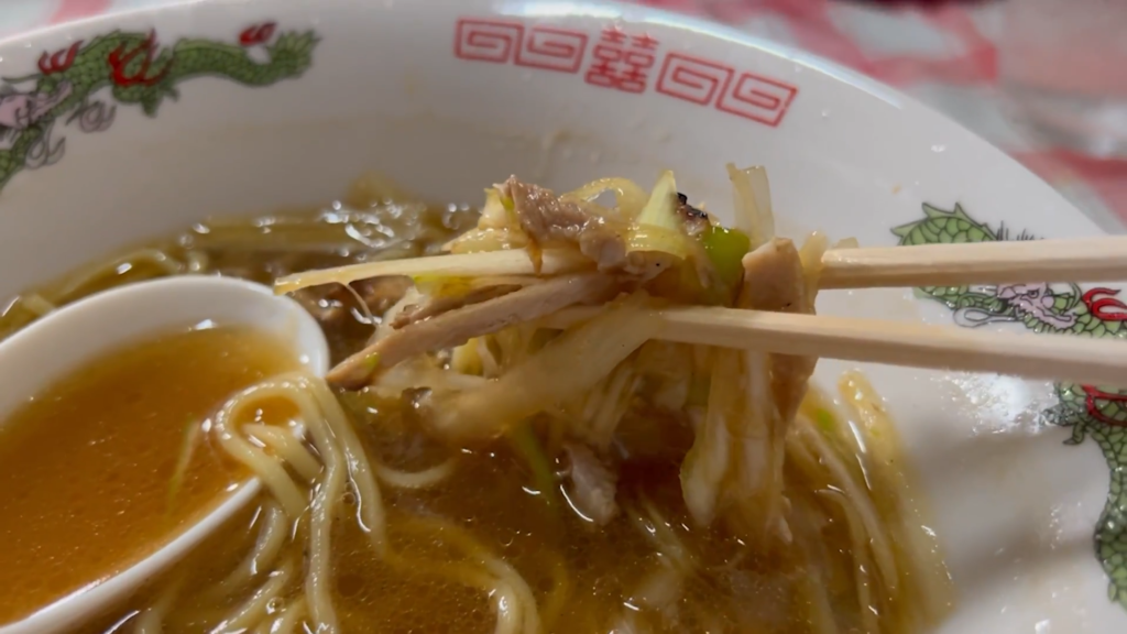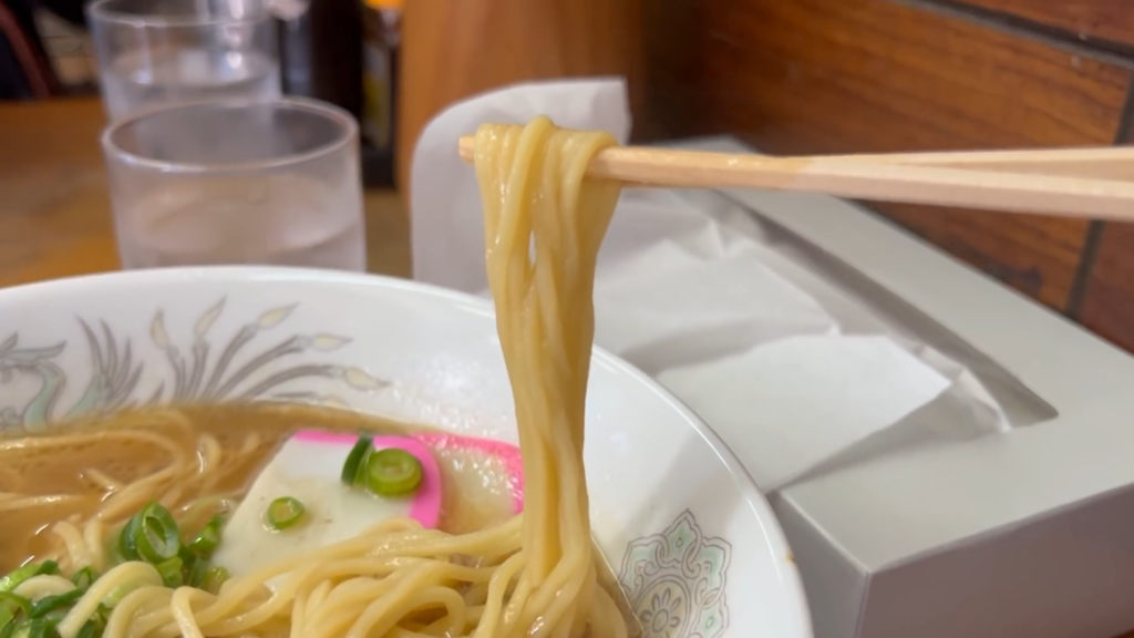 続いて麺を引き上げて、いちにのすする。つるっとしたすすり心地の中細麺が、軽やかな豚骨スープとよく絡み、さらさらと次の一口へ進めてくれます。店内の落ち着いた雰囲気と女将さんのやさしい接客も相まって、自然とほっこりする味わいです。