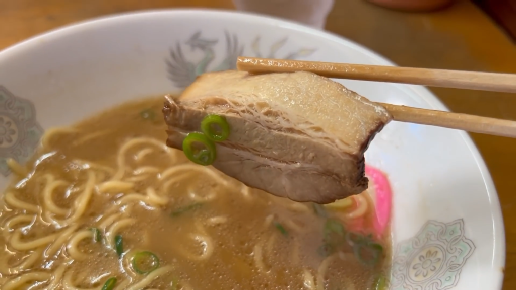 ここでチャーシューもいただきます。薄切りながら脂のりがよく、豚骨醤油スープをまとって味わいはより濃厚。存在感のある一枚で、スープとの相性も抜群です。