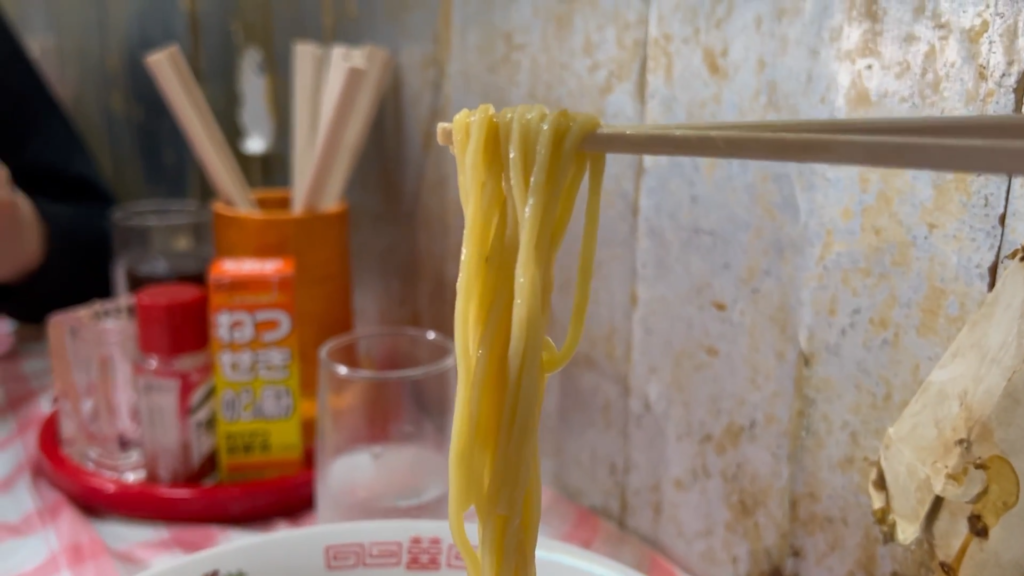 続いて麺をリフトして、せーのですすります。福助製麺所製の中細麺は、ツルッとしたすすり心地と歯切れの良さが特徴的。パンチ強めのスープに対して、麺は軽やかでバランスが良く、気づけばどんどん箸が進んでしまいます。濃いのに重すぎず、テンポよくすすれるのがこの一杯の魅力です。