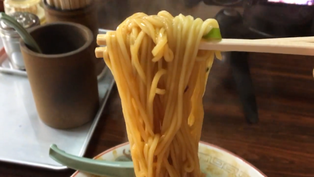 そして麺をすすっていきます。平打ちの中太麺は表面がツルツルで、ひと噛みするとプツッとした歯切れの良さがあり、小麦の風味とスープの香りが一体となって喉を駆け抜けていきます。このすすり心地はさすがの一言です。